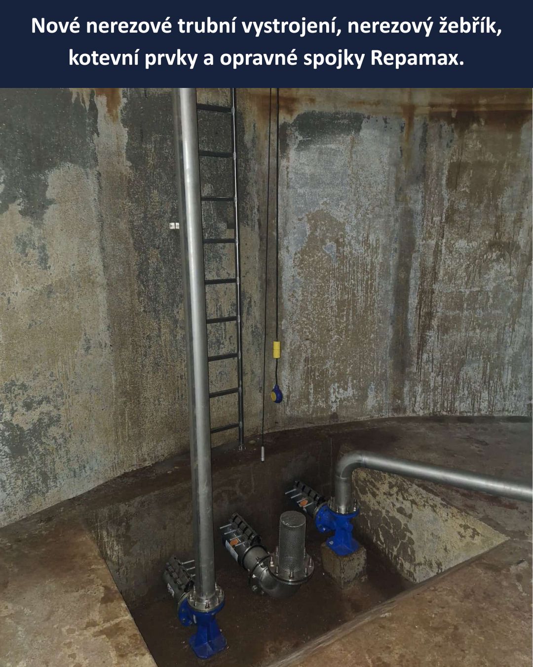 V rámci projektu jsme dodali a provedli montáž nového nerezového trubního vystrojení, nerezového žebříku a kotevních prvků. Klíčovou výzvou bylo spojení původního ocelového potrubí s nově instalovaným nerezovým potrubím. Právě v tomto kritickém místě prokázaly opravné spojky REPAMAX svou neocenitelnou hodnotu. Jejich použití zajistilo pevný, těsný a dlouhodobě spolehlivý přechod mezi oběma materiály.